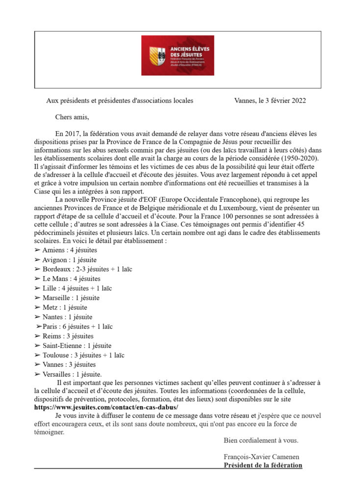 Courrier du 3 février 2022, quatre mois après le rapport de la CIASE, de la Fédération des anciens élèves et amis d’établissements tenus par la Compagnie de Jésus, ce compte-rendu détaillé du nombre de jésuites et laïcs pédocriminels coupables d’agressions sexuelles par établissement : soit, 35-36 jésuites et 4 laïcs travaillant pour eux, dans 14 établissements ! … => quelque 2500 victimes potentielles (Ratio Ciase, 63 victimes/agresseur) !!!